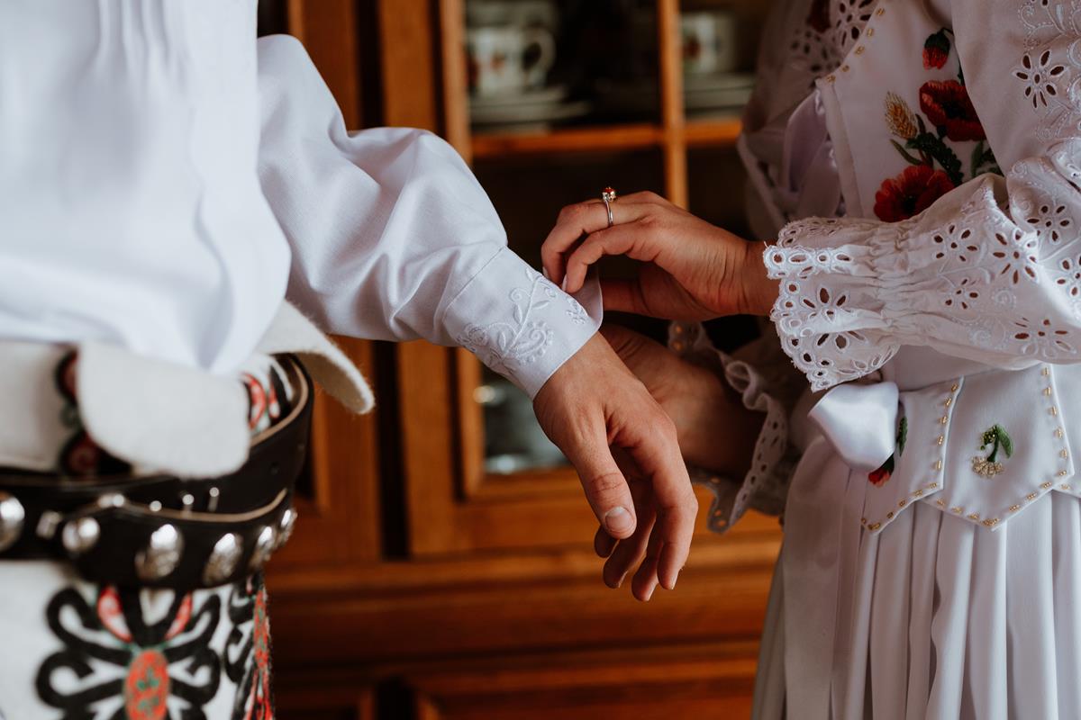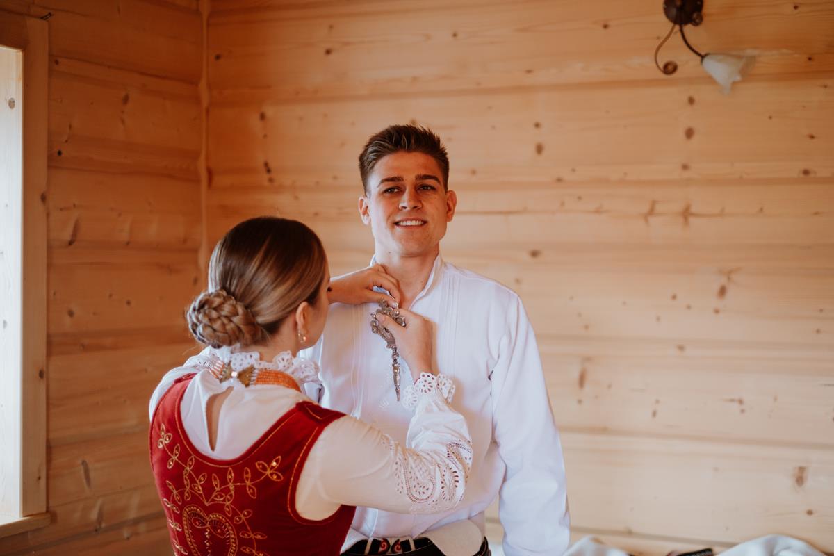 Po przybyciu Oliwia musiała mu zmienić jego kawalerską koszulę na tą ślubną. Następnie odbyło się wspólne, wzruszające błogosławieństwo. I byli gotowi wyruszać na ceremonię ślubną do kościoła w Kościelisku, oczywiście wspaniałymi konnymi zaprzęgami, jak to zresztą często bywa na góralskim weselu.