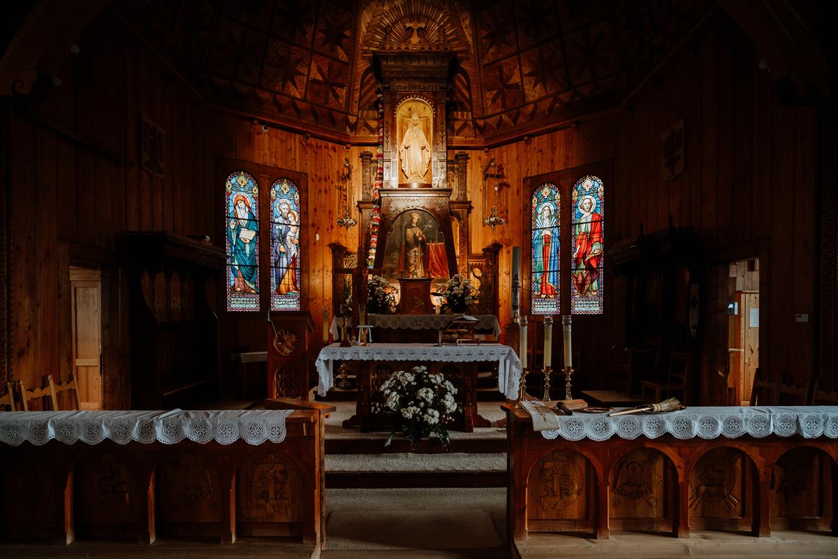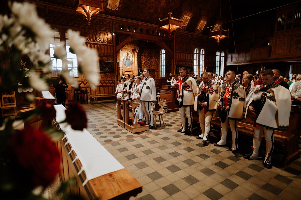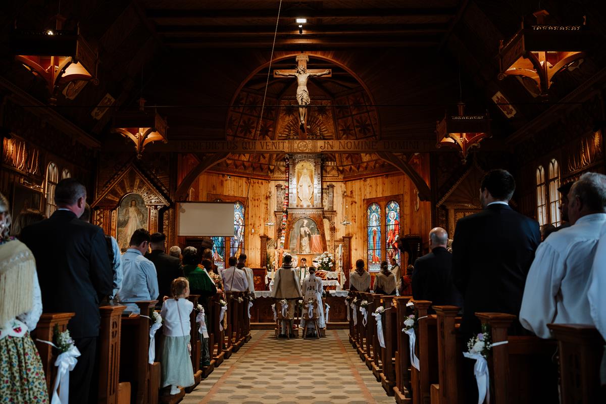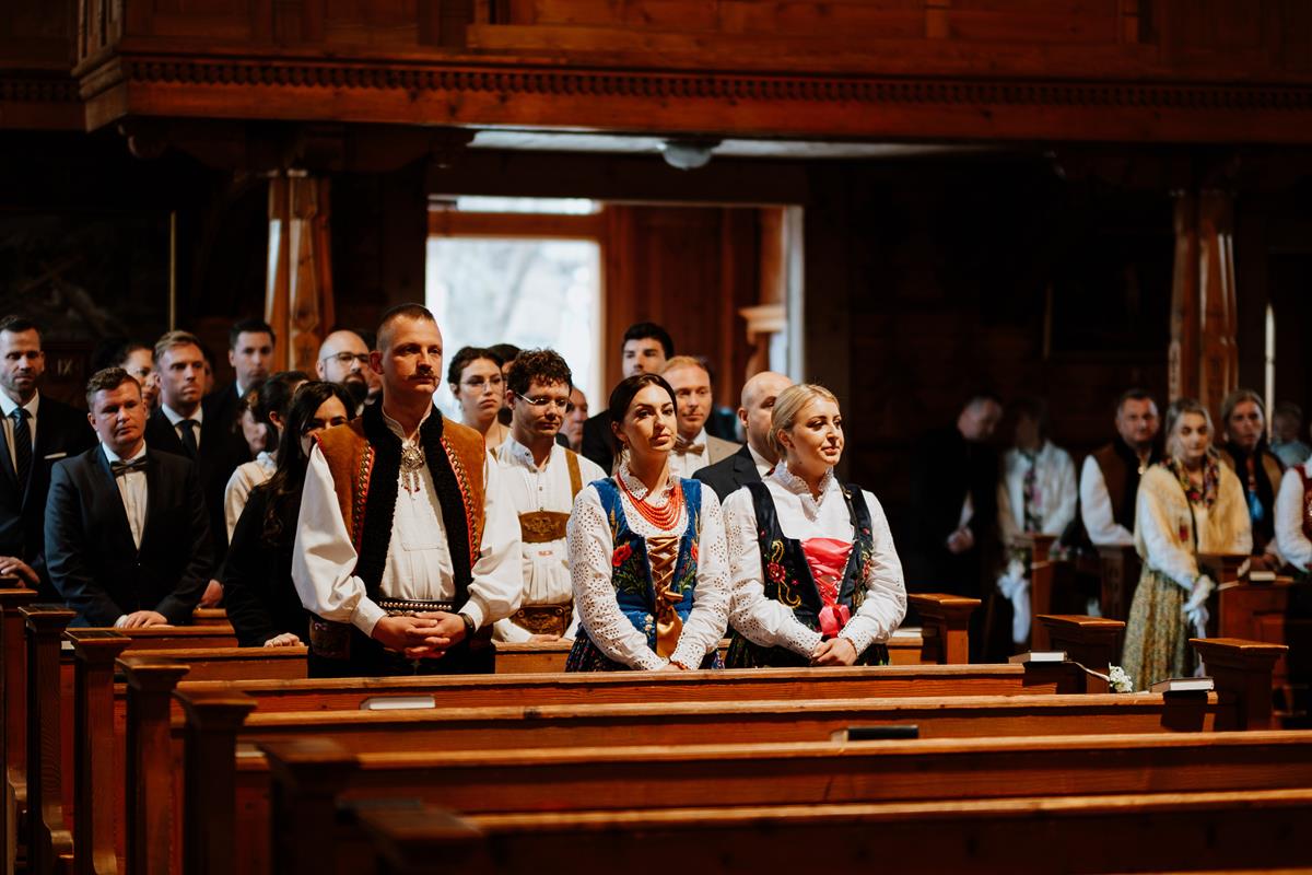 Ceremonia ślubna odbyła się w Kościele św. Kazimierza Królewicza w Kościelisku. Para młoda, ubrana była w tradycyjne stroje góralskie, tym samym podkreślając swoją głęboką więź z kulturą góralską. Rzecz jasna wyglądali wprost wspaniale w tym przepięknym, drewnianym zabytkowym kościele. Musicie wiedzieć, że uwielbiamy fotografować śluby w kościele w Kościelisku. Przede wszystkim to na prawdę przepiękna świątynia. Co więcej, do tego wspaniale oświetlona. Niewątpliwie panuje tutaj unikalny klimat. Klimat, który doskonale się wpisuje nie tylko w góralskie wesela. Jednakże również śluby w tradycyjnej sukni ślubnej i garniturze również znakomicie.tutaj wyglądają. Z tego powodu jeżeli rozważacie wesele w górach z całego serca polecamy ślub w kościele w Kościelisku. Niezależnie od tego czy będzie to wesele góralskie, czy też ślub w górach w garniturze oraz sukni ślubnej.