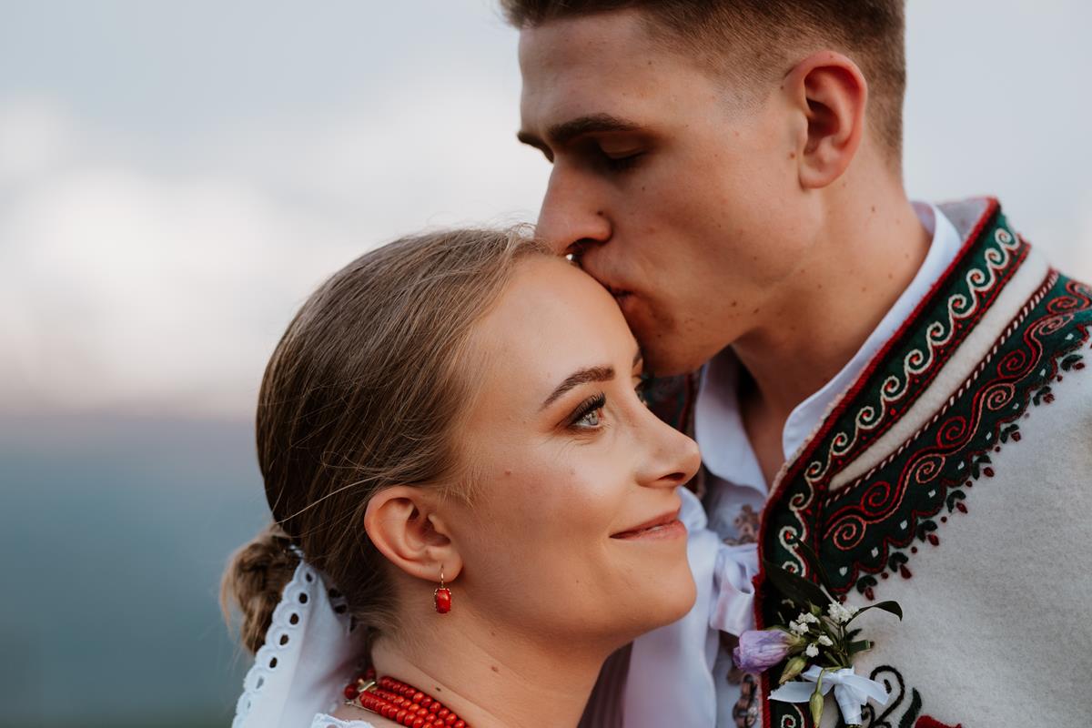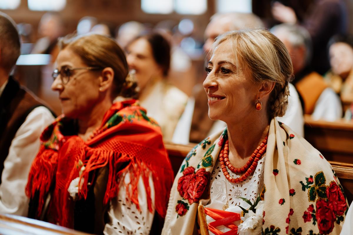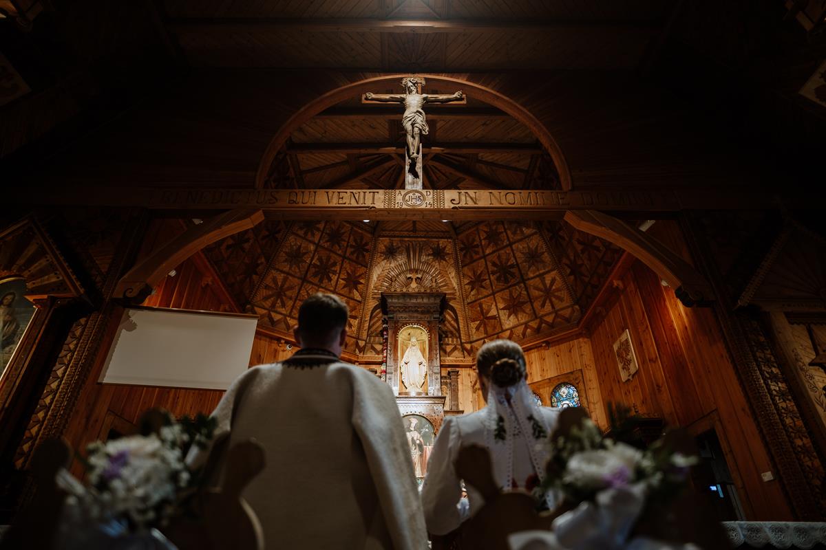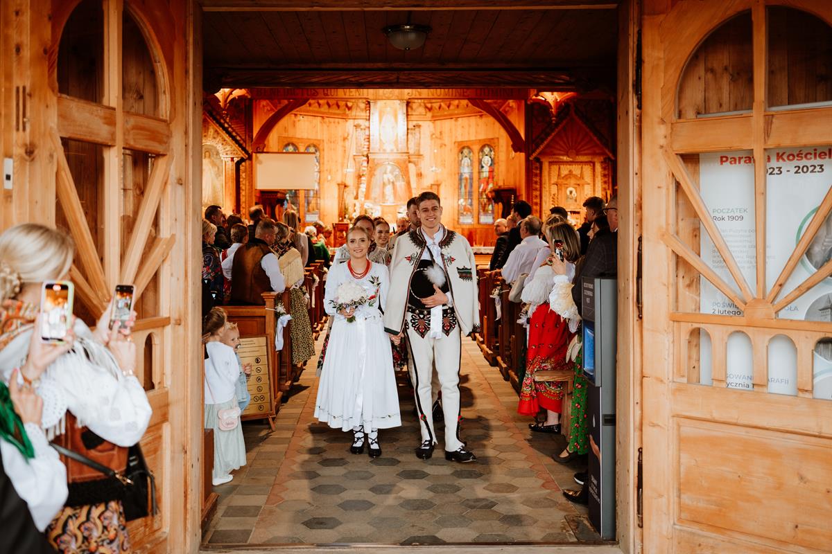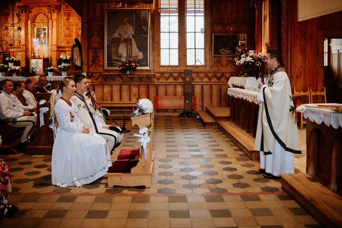 Ceremonia ślubna odbyła się w Kościele św. Kazimierza Królewicza w Kościelisku. Para młoda, ubrana była w tradycyjne stroje góralskie, tym samym podkreślając swoją głęboką więź z kulturą góralską. Rzecz jasna wyglądali wprost wspaniale w tym przepięknym, drewnianym zabytkowym kościele. Musicie wiedzieć, że uwielbiamy fotografować śluby w kościele w Kościelisku. Przede wszystkim to na prawdę przepiękna świątynia. Co więcej, do tego wspaniale oświetlona. Niewątpliwie panuje tutaj unikalny klimat. Klimat, który doskonale się wpisuje nie tylko w góralskie wesela. Jednakże również śluby w tradycyjnej sukni ślubnej i garniturze również znakomicie.tutaj wyglądają. Z tego powodu jeżeli rozważacie wesele w górach z całego serca polecamy ślub w kościele w Kościelisku. Niezależnie od tego czy będzie to wesele góralskie, czy też ślub w górach w garniturze oraz sukni ślubnej.