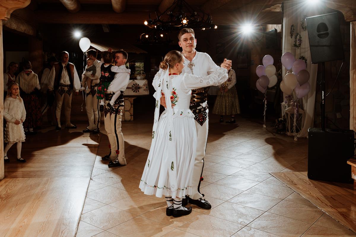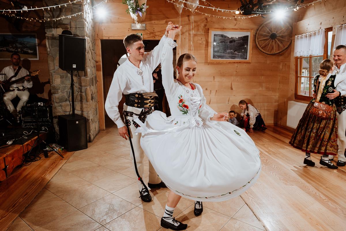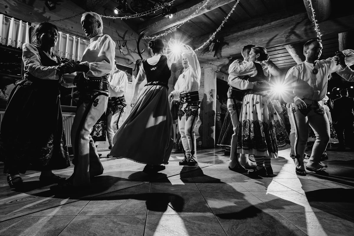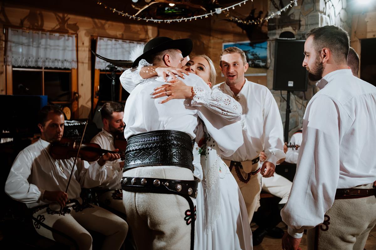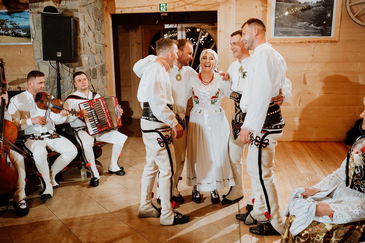 Jak to na każdym góraslkim weselu, wieczorem na Harendzie odbyły się cepowiny. To niewątpliwie najbardziej wzruszający i wspaniały moment góralskiego wesela. Po pierwsze to podczas cepowin panna młoda pozbywa się wianka. Po drugie pan młody oddaje piórka z kapelusza. Również teraz zatańczą swój góralski taniec. W dodatku podczas cepowin można złożyć parze młodej życzenia! Co więcej, właśnie wtedy można usłyszeć najwięcej śpiewu i góralskiej muzyki. Zatem zapraszamy Was do zdjęć z wyjątkowego dnia Oliwii i Miklasa, z ich góralskiego wesela w Karczmie Harenda
